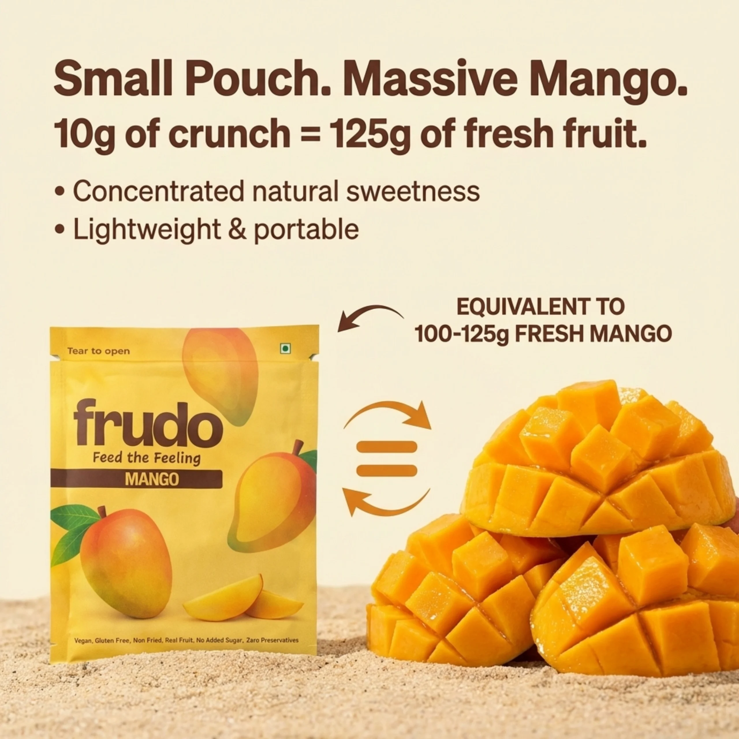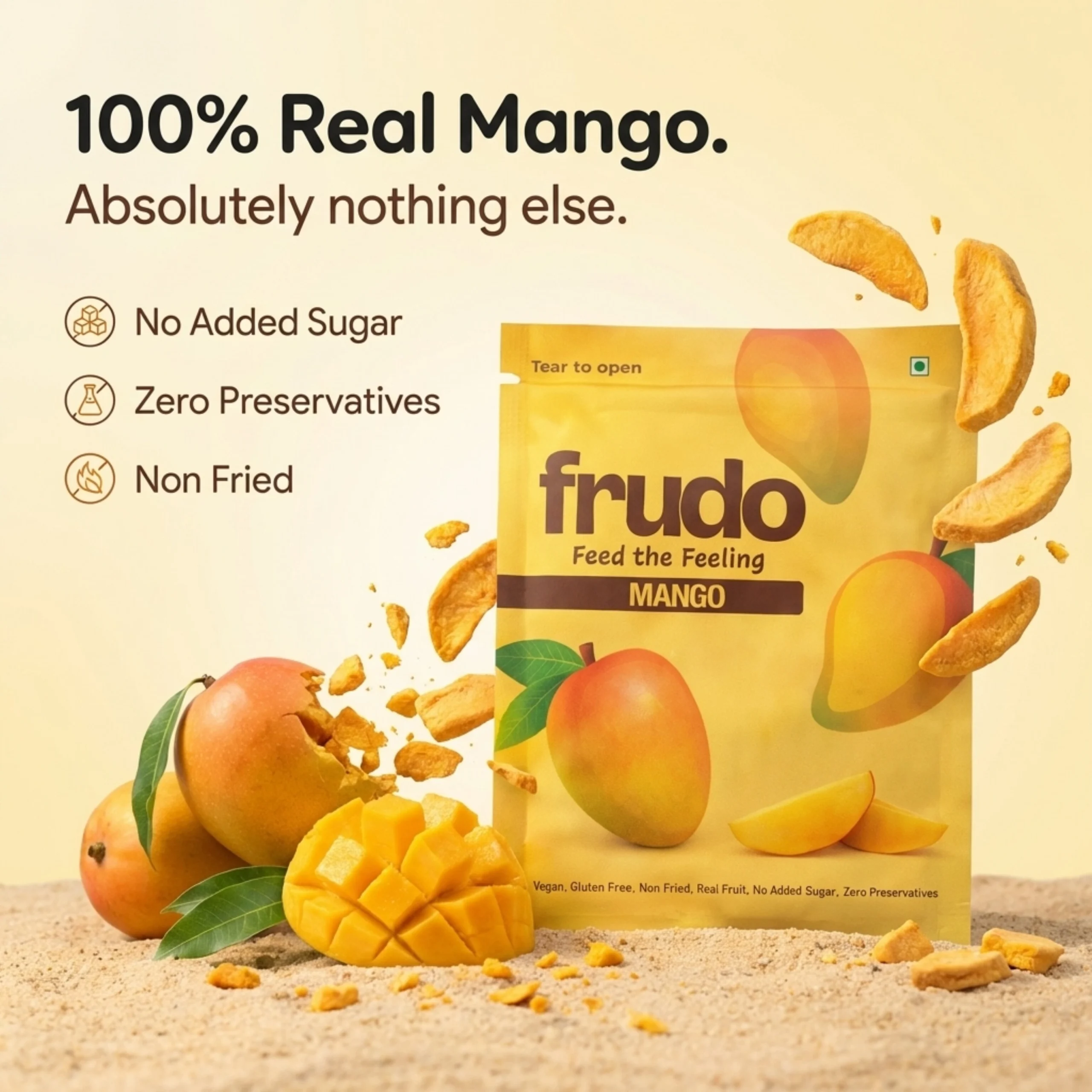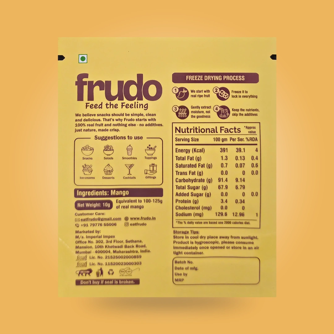 Frudo Freeze Dried Mango are made from real Mango, offering a naturally sweet and flavorful snack perfect for anytime, anywhere enjoyment.